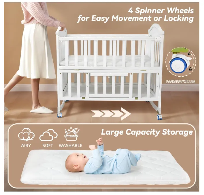 • Lightweight and practical crib with wheels: Equipped with 4 wheels for easy movement around the home, sturdy yet portable, perfect for small spaces.