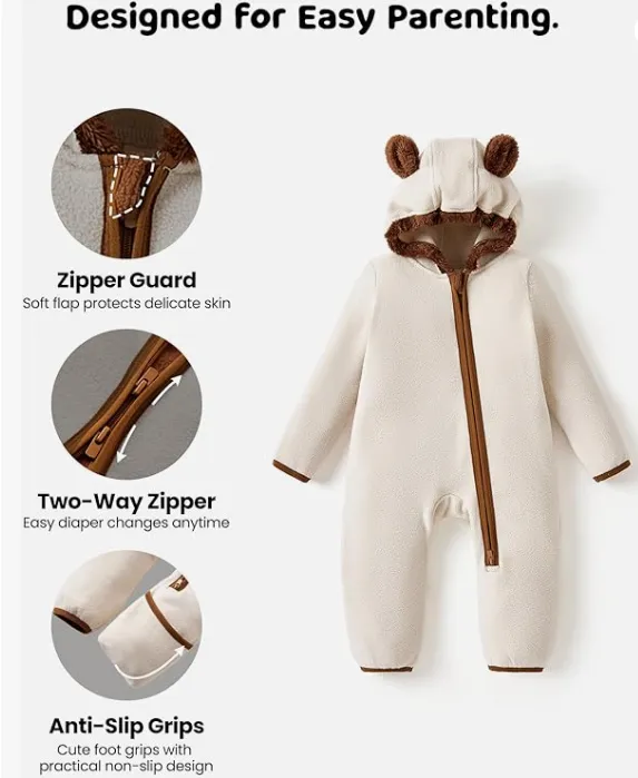 PATPAT Newborn Fleece Hooded Romper – Soft, Warm, Car Seat Friendly, Easy Snap & Adorable Design